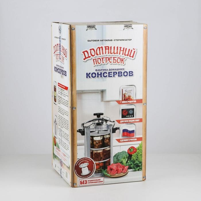 Автоклав — лучший инструмент для стерилизации продуктов питания, в том числе консервации. Прибор нагревает воздух в камере до температуры 120 °C, что уничтожает все вредоносные микроорганизмы. Автоклав имеет объём 22 литра и массу не более 7,5 кг. Толщина дна 4,5 мм, толщина стенок 1,2 мм. Рассчитан на 9 банок по 1 литру и 12 банок 0,5 литров. Побалуйте себя вкусной домашней едой без химии и вредных примесей.