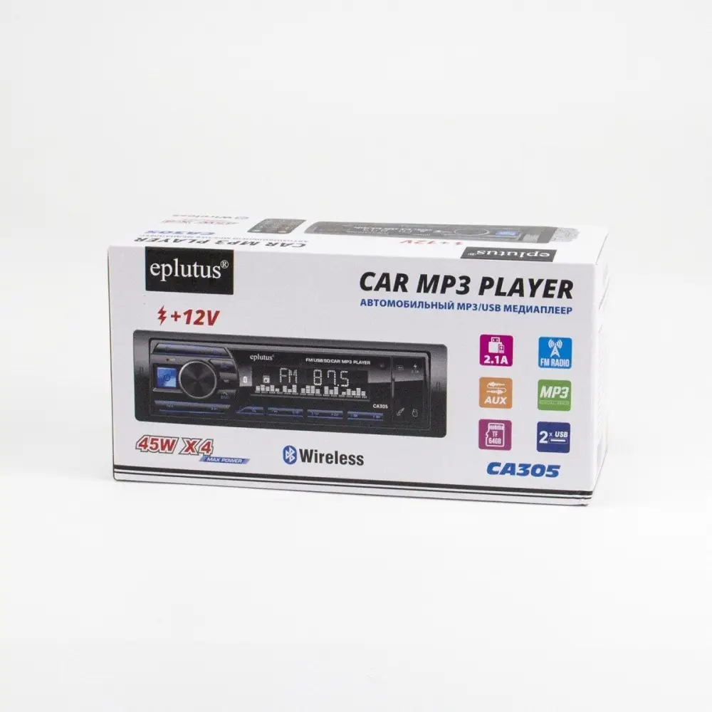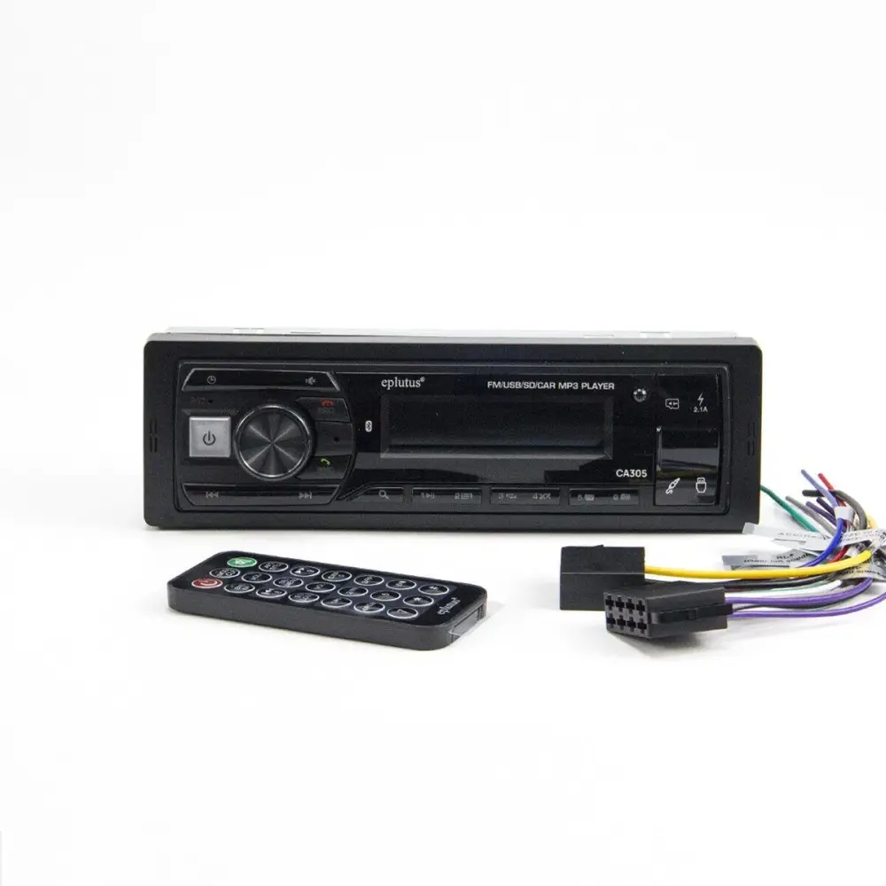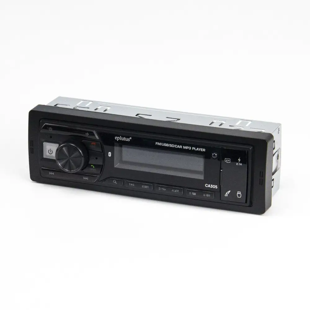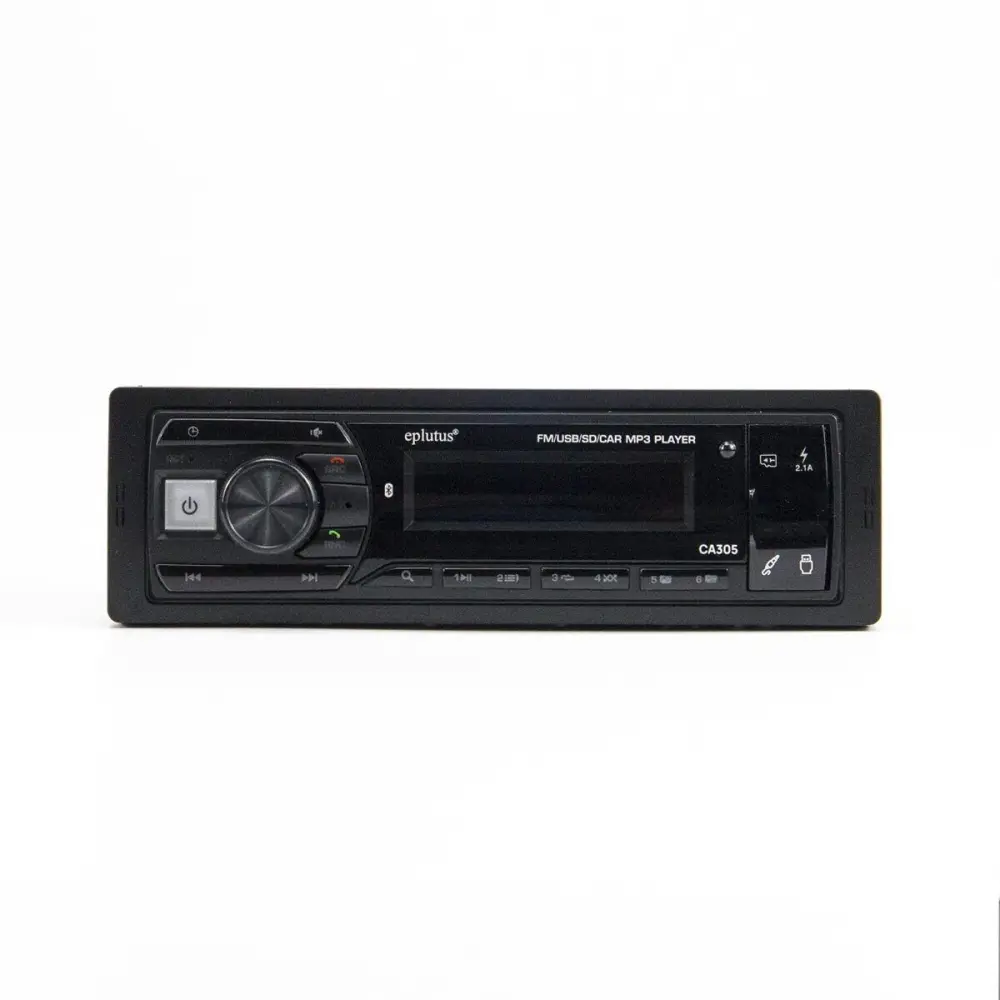 Магнитола оборудована наглядным жидкокристаллическим дисплеем, антенным входом, портами USB и AUX, что позволяет применять ее для гарантированно качественного прослушивания радипередач FM диапазона, а также воспроизведения аудиофайлов с флеш-карт, смартфонов и других компьютеризированных внешних гаджетов. Для сопряжения со сторонними устройствами Eplutus CA305 использует беспроводную связь Bluetooth версии 5.0.