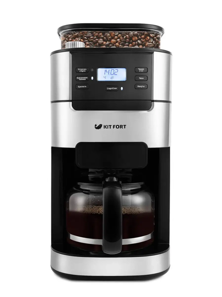 Автоматическая кофемашина Kitfort КТ-720 — это превосходный прибор для приготовления ароматного зернового кофе. Эта техника станет незаменимой на вашей кухне, позволяя наслаждаться свежим напитком одним нажатием кнопки. Встроенная кофемолка автоматически измельчает зерна и засыпает молотый кофе в фильтр, что обеспечивает насыщенный вкус и аромат. Таймер отложенного старта позволяет запрограммировать включение машины заранее: вечером залейте воду, добавьте молотый кофе и установите таймер — утром вас будет ждать готовый напиток. Функция автоматического отключения гарантирует безопасность использования и экономию электроэнергии. Вода в резервуаре нагревается до 70–80 °С, после чего медленно поступает в фильтр с молотым кофе. Готовый напиток попадает в кофейник, а по окончании приготовления машина переходит в режим подогрева на 35 минут. Кофемашина оснащена противокапельной системой: затвор останавливает подачу при вынимании кофейника, позволяя налить чашку без ожидания завершения процесса. Резервуар объёмом 1,5 л позволяет приготовить до 12 чашек по 125 мл за раз — идеально для дома или офиса. Прозрачный корпус кофейника даёт возможность контролировать количество оставшегося кофе. Панель управления с дисплеем и световыми индикаторами упрощает использование устройства. Эта бытовая техника от Kitfort станет отличным дополнением вашего дома благодаря своей функциональности и удобству использования. Кухонный прибор таби не только украсит вашу кухню своим стильным дизайном, но также обеспечит вас качественным зерновым кофе каждый день.