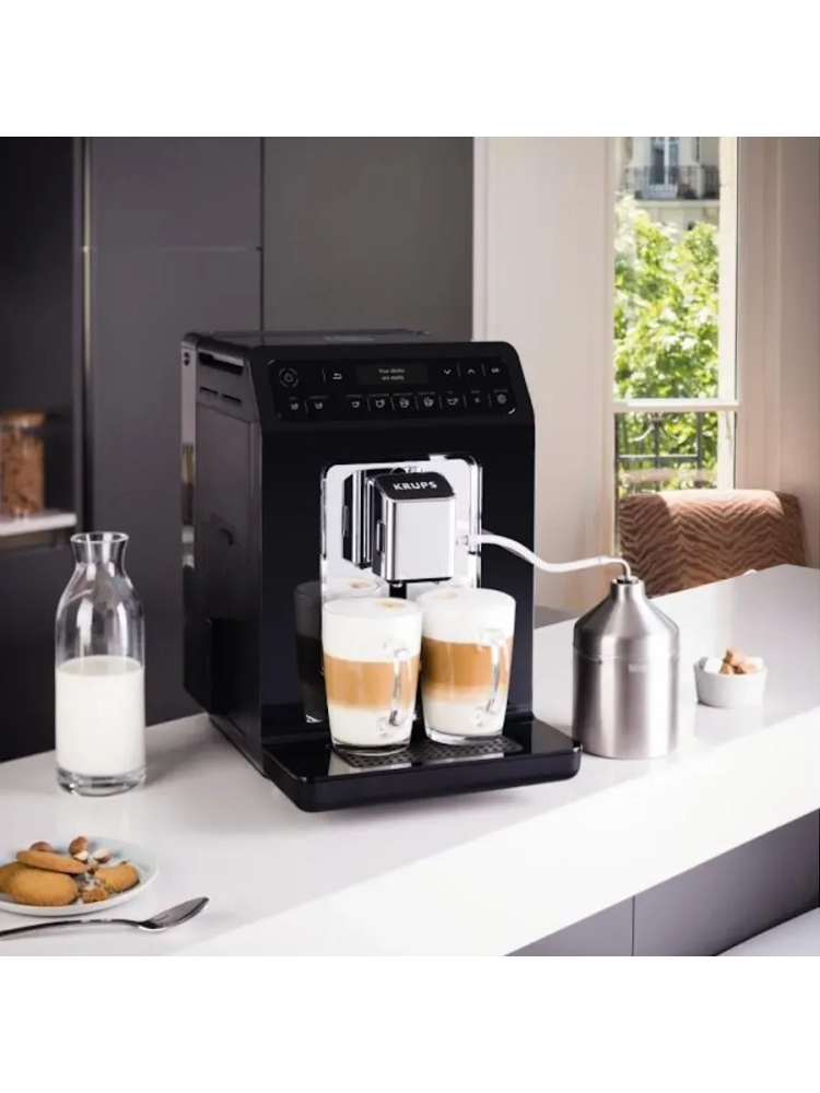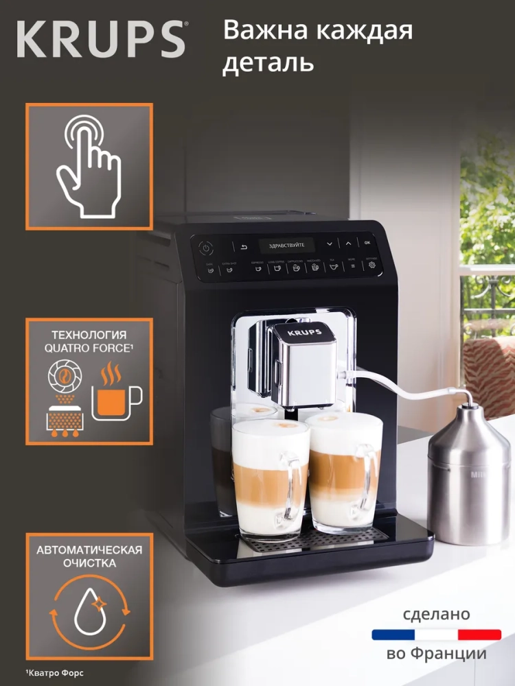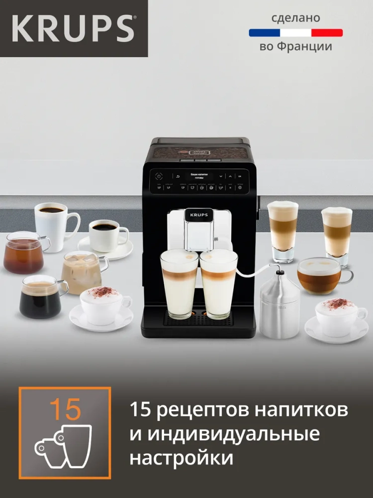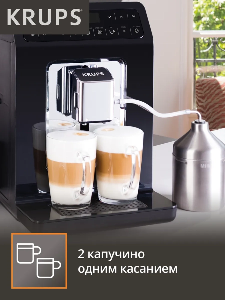 Автоматическая кофемашина Krups Evidence EA891810 Black имеет номинальное давление 15 бар. Благодаря этому максимально раскрываются ароматические особенности кофейного напитка. В меню приготовления входят: эспрессо, эспрессо лунго, двойной эспрессо, ристретто, американо, капучино, латте макиато. Одним из главных преимуществ прибора является автоматическое взбивание пенки для капучино. Также он может быть использован в качестве электрочайника для подогрева воды.