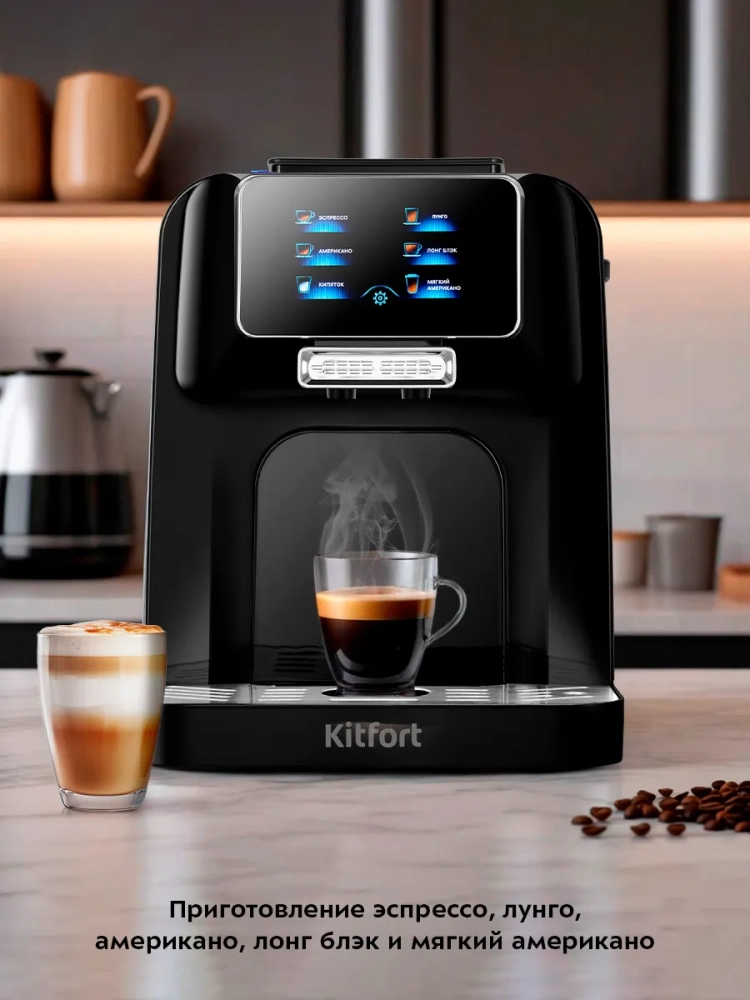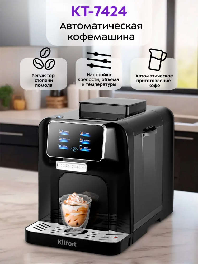 Автоматическая кофемашина Kitfort КТ-7424 — отличный выбор для гурманов, которые не хотят тратить много времени и сил, чтобы насладиться полным букетом вкуса свежезаваренного кофе. Кофемашина автоматически приготовит эспрессо, лунго, американо, лонг блэк и мягкий американо — достаточно всего лишь нажать на кнопку. В устройстве также можно включить подачу горячей воды.