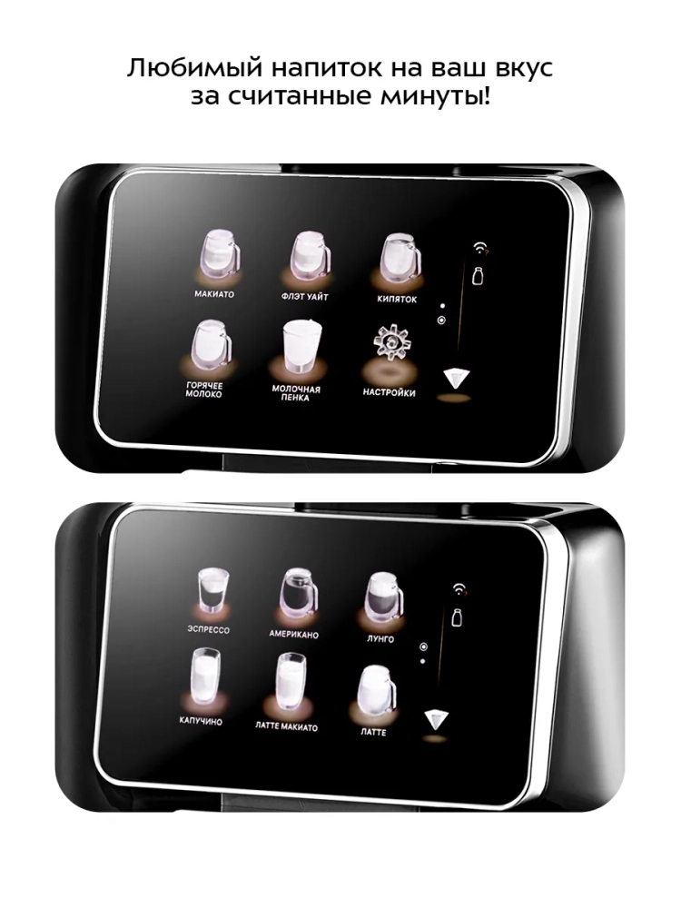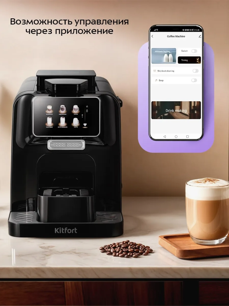 Кофемашина KT-7460 позволяет настроить крепость кофе за счет количества кофейных зерен, выбрать температуру и объем напитка, степень темперовки кофейной таблетки, а также количество горячей воды для американо, пышность молочной пенки и количество горячего молока для капучино, латте макиато, латте, макиато и флэт уайт. Устройство имеет понятную индикацию и наглядно сигнализирует об ошибках в процессе использования. Управлять устройством также можно дистанционно через мобильное приложение.