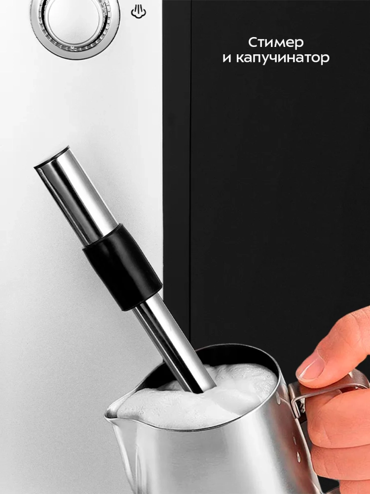 У кофемашины есть съемный стимер. Благодаря наличию стимера вы можете включить подачу горячей воды или пара. Паром можно удобно подогреть напитки или самостоятельно взбить молочную пену в питчере. Вы можете снять стимер и вместо него установить капучинатор.