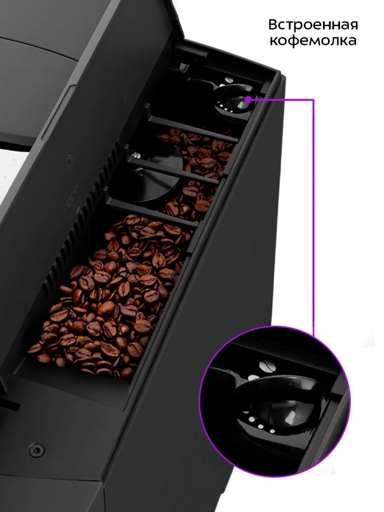 Встроенная кофемолка позволяет качественно измельчать кофейные зерна непосредственно перед приготовлением кофе, что положительно отражается на вкусе готового напитка. Кофемолка имеет металлические конические жернова, которые препятствуют излишнему перегреванию зерен при измельчении и позволяют получить равномерный помол. Регулировка степени помола осуществляется путем изменения расстояния между жерновами. Также в кофемашине можно сварить кофе из уже молотого кофе. Для этого есть специальное отверстие, через которое молотый кофе попадает в заварочный механизм.