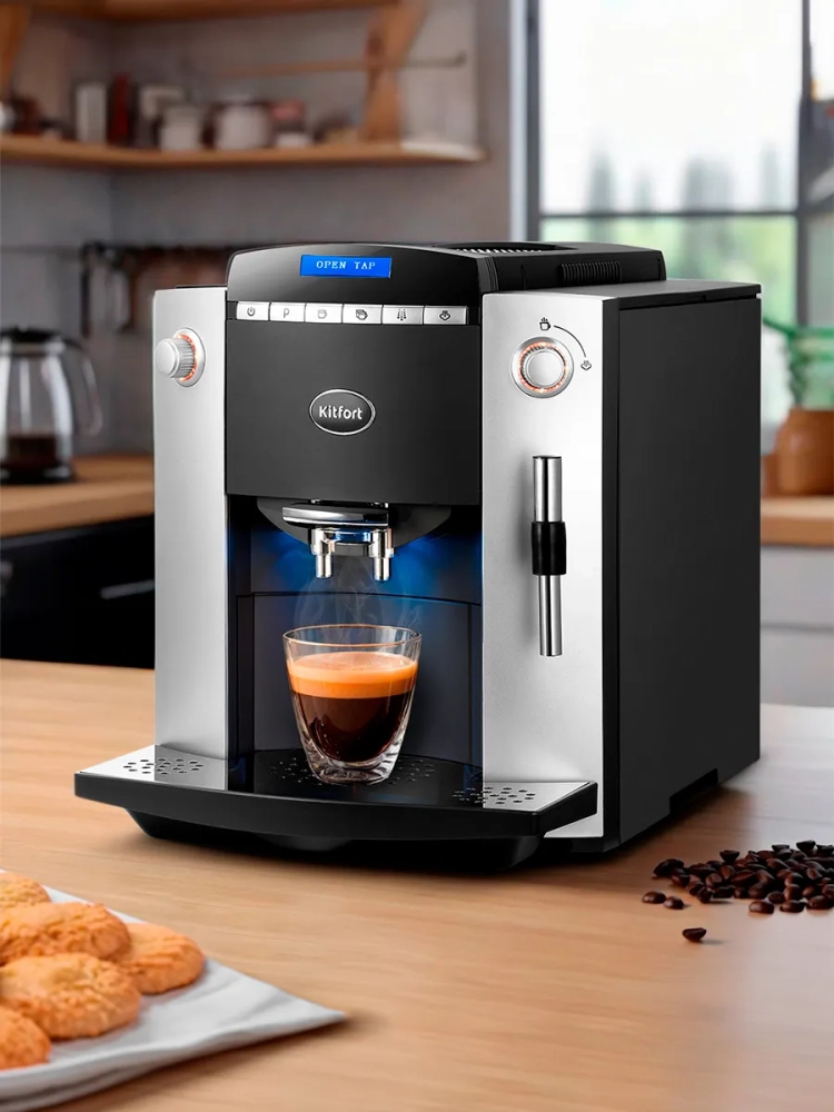 Автоматическая кофемашина Kitfort КТ-7320 — отличный выбор для гурманов, которые не желают тратить много времени и сил, чтобы насладиться полным букетом вкуса свежезаваренного кофе. Кофемашина готовит эспрессо, двойной эспрессо, молочную пенку, а также горячую воду. На основе эспрессо и молока вы можете приготовить множество кофейных напитков, например, американо, капучино, латте, макиато, или флэт уайт.