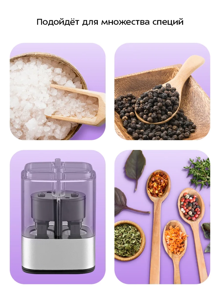 Устройство имеет конструкцию «2 в 1»: контейнер для специй разделен на две части для измельчения двух видов специй. Мельница выполнена из сочетания пластика и нержавеющей стали с прозрачным контейнером для специй, что позволит следить за количеством содержимого в нем.