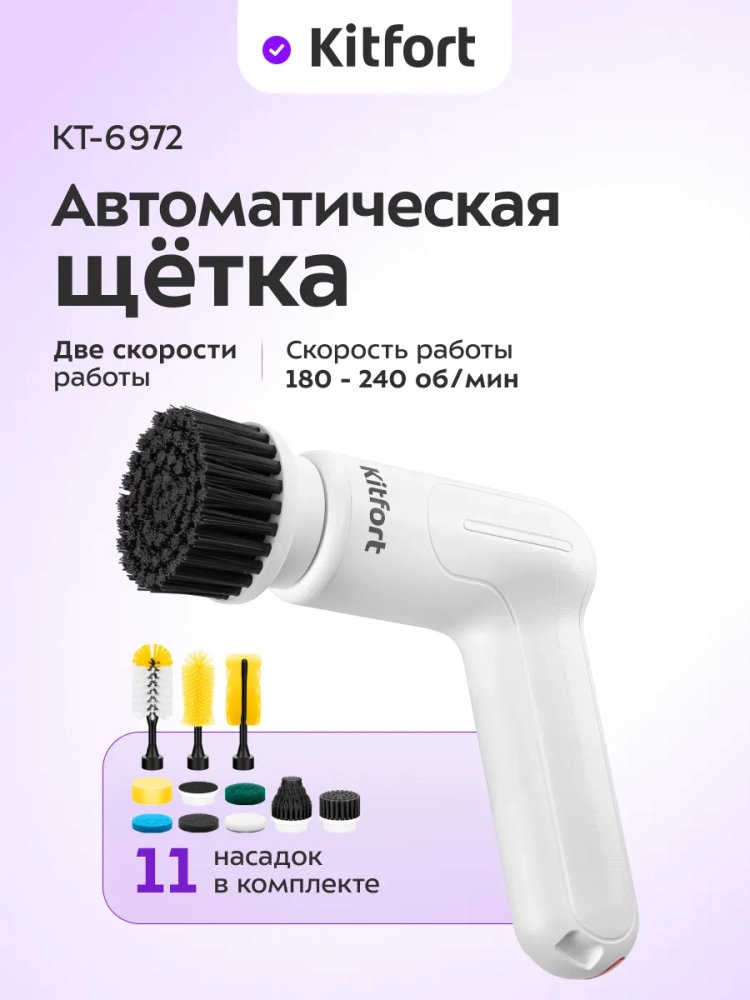 Автоматическая щетка для уборки Kitfort КТ-6972 предназначена для очистки самых разных поверхностей в доме или в автомобиле. При помощи специальных насадок из комплекта автоматическая щетка позволит вам без усилий очистить раковину и плиту на кухне, сантехнику, кафель, плинтуса и многое другое.