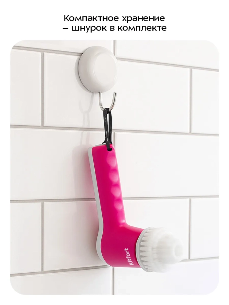 Благодаря эргономичной форме корпуса прибор удобно держать в руке, а также вы можете повесить щетку на хранение с помощью шнурка.