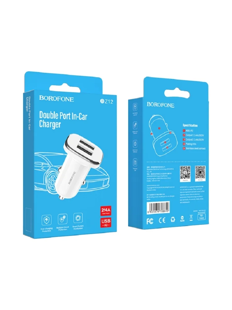 АЗУ BOROFONE BZ12 Lasting Power — это надёжное и компактное зарядное устройство для смартфонов, обеспечивающее быструю и стабильную зарядку в дороге. Оно имеет два USB-выхода с максимальной силой тока 2,4 А и выходное напряжение 5 В. Устройство совместимо с любыми устройствами, использующими USB-порт для зарядки, и подходит для автомобилей с напряжением 12–24 В.