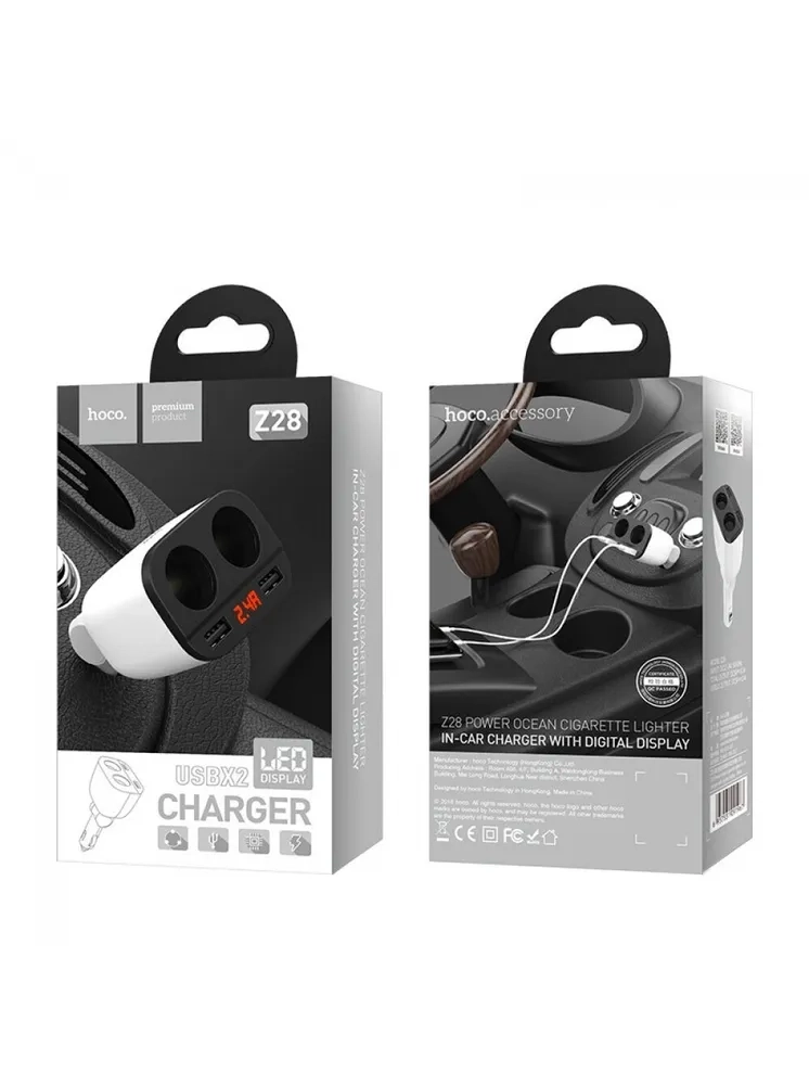 Автомобильное зарядное устройство Hoco Z28 - это USB зарядка для мобильных устройств с 2-мя USB портами и 2-мя дополнительными разъёмами для прикуривателя. АЗУ предназначено для подключения к бортовой сети автомобиля и оснащено цифровым дисплеем для контроля тока зарядки. USB порт выдаёт максимальный ток заряда - 5 вольт до 3.1 ампер. Корпус зарядного устройства изготовлен из огнеупорного пластика.