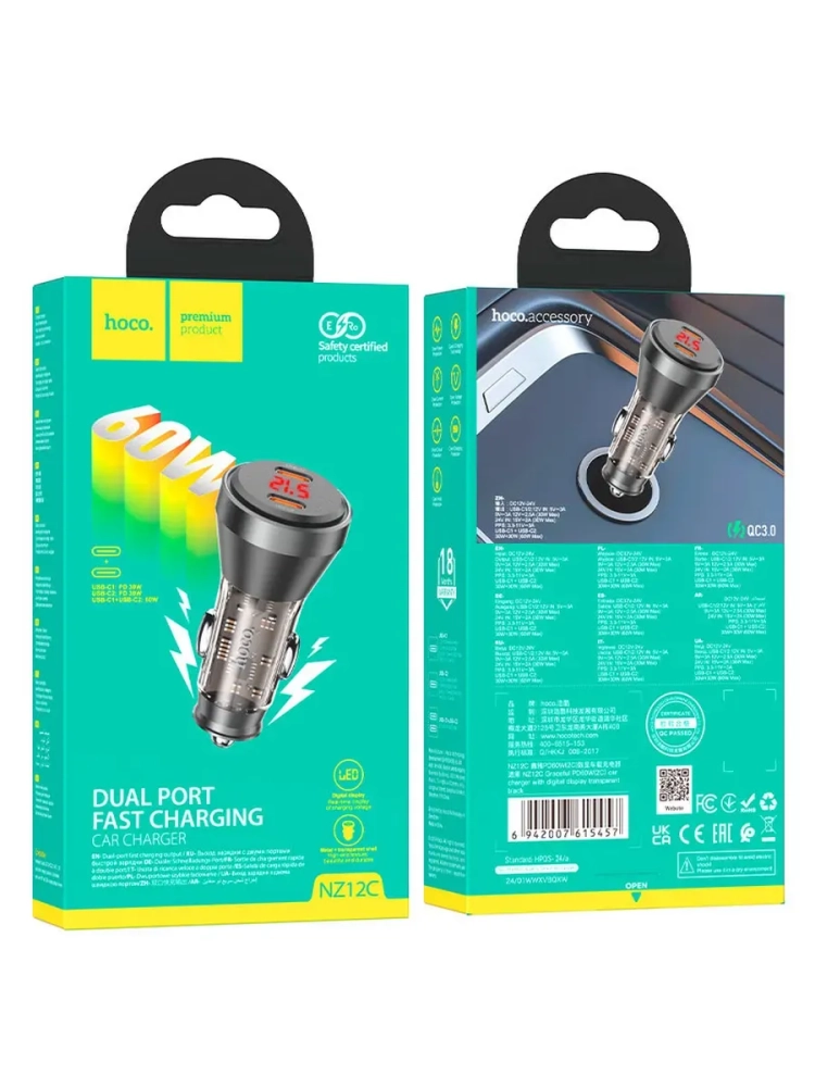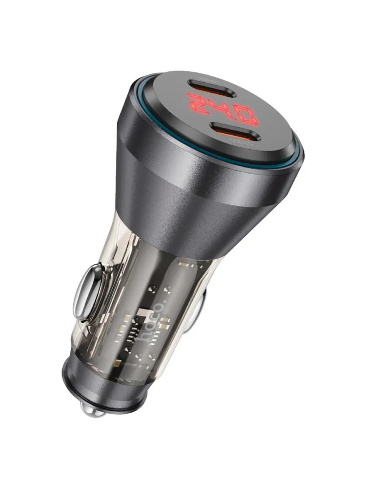 Hoco NZ12C - быстрое автомобильное зарядное устройство с дисплеем для iPhone 15 и других смартфонов/планшетов. Поддерживает полноскоростную зарядку двух устройств сразу. Суммарная выходная мощность - 60 Вт (30 Вт + 30 Вт).
