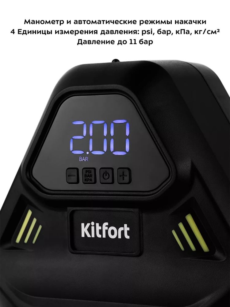 У насоса Китфорт KT-6036 есть дисплей, на котором отображается предустановленное давление при настройке и затем текущее давление в шинах. Насос работает от прикуривателя автомобиля, поэтому вы можете брать его с собой в поездки или хранить в багажнике машины. Для того, чтобы накачать одно автомобильное колесо с 0 до 2,2 бар, потребуется около 5 минут. Однако после 10–15 минут работы насоса необходимо сделать перерыв, так как компрессор и шланг сильно нагреваются.
