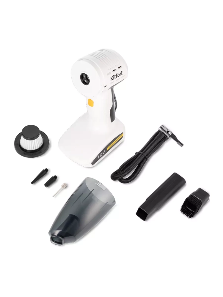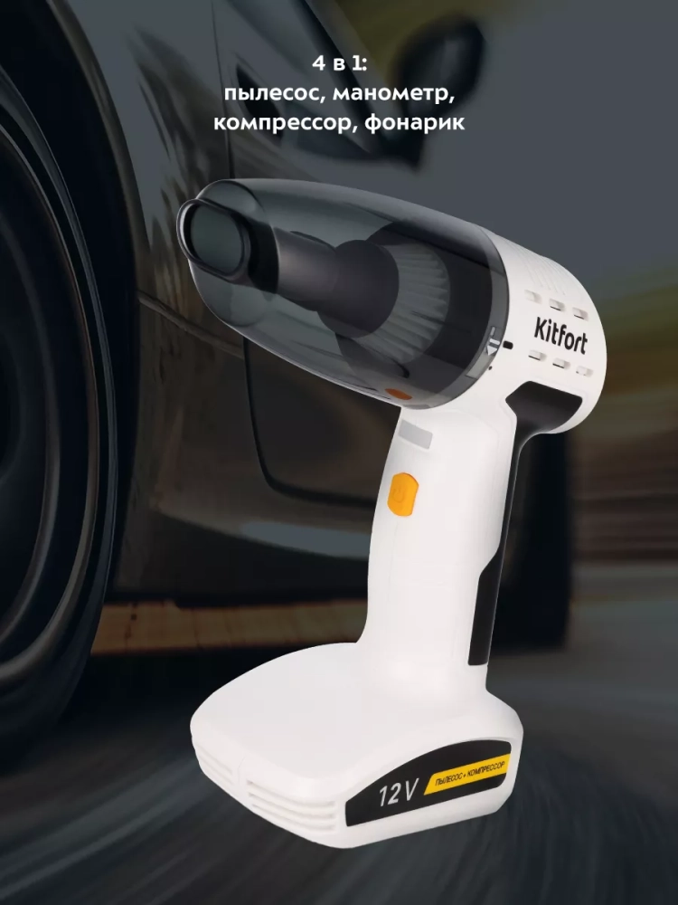 Автомобильный пылесос Kitfort КТ-5169 (4 в 1) сочетает в себе функции 4 устройств: пылесоса, который легко справится с пылью и мусором, фонарика, манометра для измерения давления в шинах и компрессора для накачки шин, мячей, надувных игрушек и матрасов.