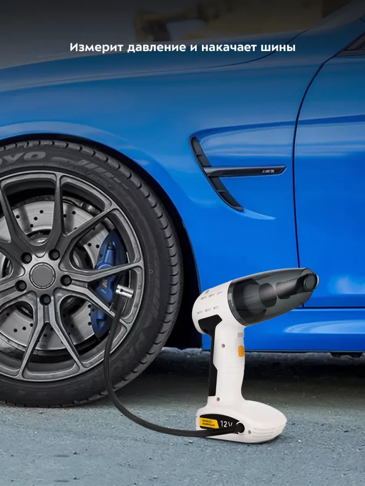 Прибор работает как от прикуривателя. Благодаря этому вы можете очистить салон автомобиля в дороге, проверить давление в шинах или накачать их. У пылесоса есть цифровой дисплей с кнопками, с помощью которых можно устанавливать целевое давление.