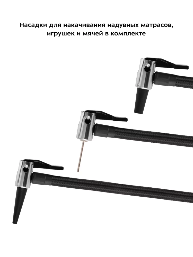 Пылесос имеет комплект насадок для уборки, шланг для накачки шин, многофункциональные насадки для накачки надувных матрасов, игрушек, а также иглу для накачки мячей.
