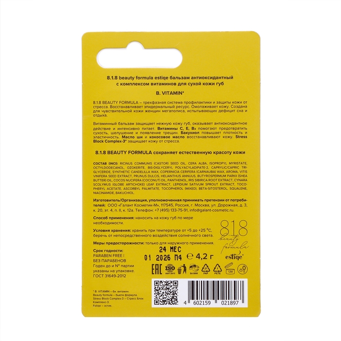 Бальзам антиоксидантный 818 b.f.e. с комплексом витаминов для сухой кожи губ, 4,2 г