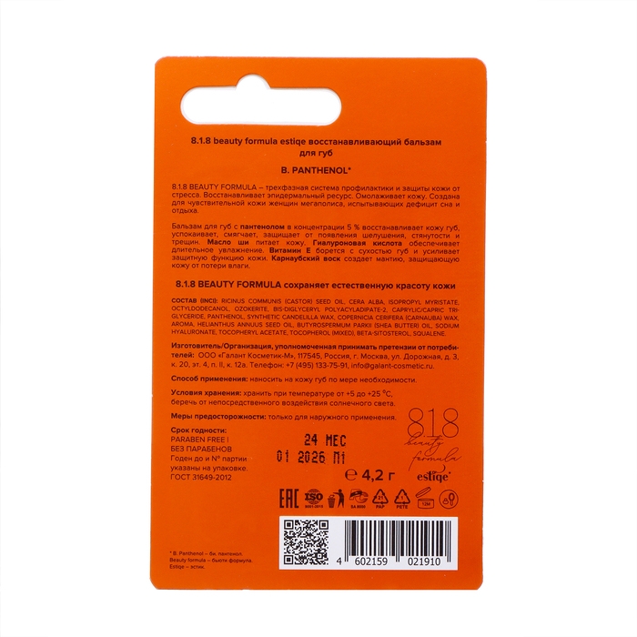 Состав: ricinus communis (castor) seed oil, cera alba, isopropyl myristate, octyldodecanol, ozokerite, bis-diglyceryl-polyacyladipate-2, caprylic/capric triglyceride, panthenol, synthetic candelilla wax, copernicia cerifera (carnauba) wax, aroma, helianthus annus seed oil, butyrospermum рarkii (shea butter) oil, sodium hyaluronate, tocopheryl acetate, tocopherol (mixed), beta-sitosterol, squalene.