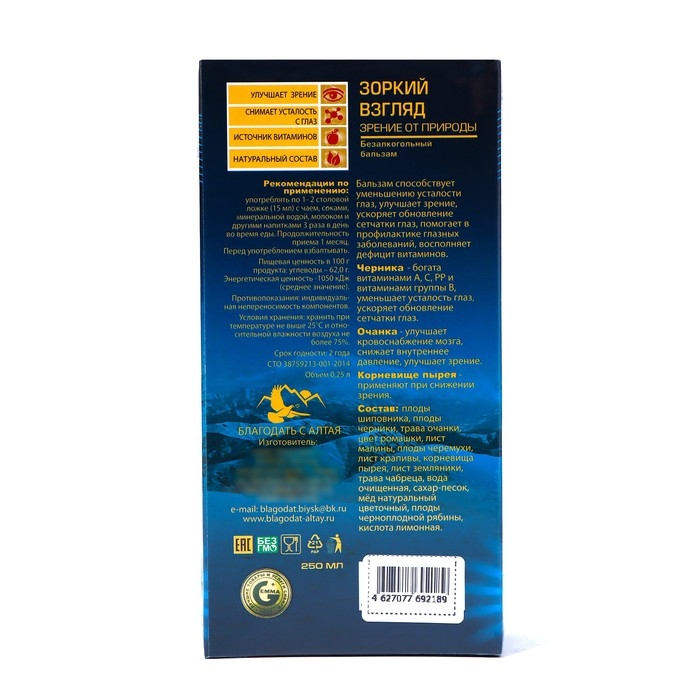 Бальзам способствует уменьшению усталости глаз, улучшает зрение, ускоряет обновление сетчатки глаз, помогает в профилактике глазных заболеваний, восполняет дефицит витаминов.