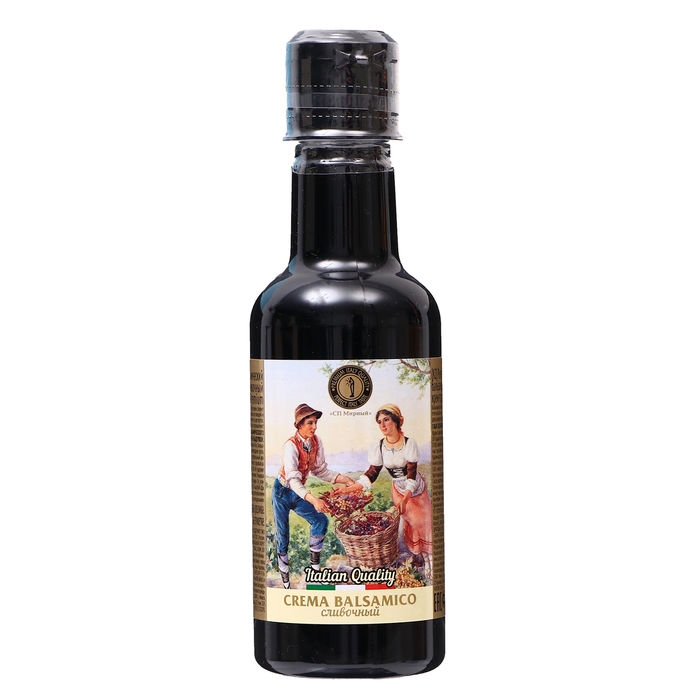 Состав: концентрированный виноградный сок, бальзамический уксус 38 % (винный уксус, виноградное сусло, краситель Е-150d) натуральный ароматизатор «Сливочный», сливки, загуститель конжаковая камедь Е425. Массовая доля уксусной кислоты 3 %. Не содержит консервантов.