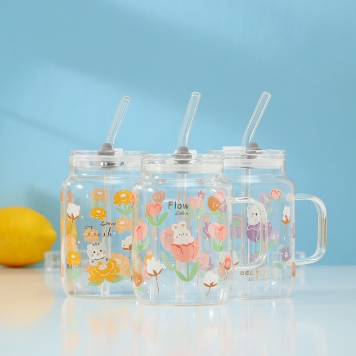 Набор кружек стеклянных Доляна «Летняя прохлада», 2 предмета: 2 кружки с крышками и трубочками 450 мл