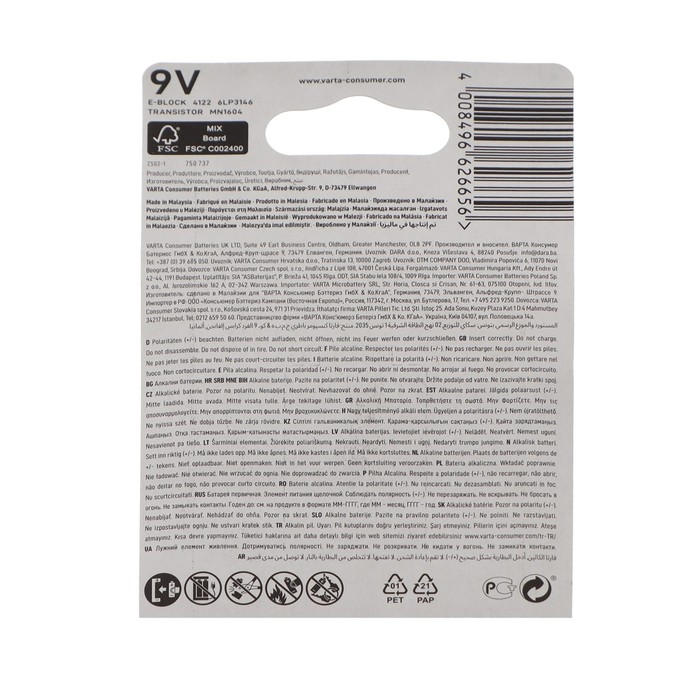 Батарейка алкалиновая Varta Energy, 6LR61-1BL, 9В, крона, блистер, 1 шт.