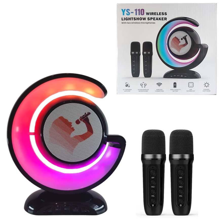 Bluetooth колонка с 2 микрофонами YS-110 - идеальное решение для проведения вечеринок по случаю дня рождения, а также мероприятий, конференций, классных часов, на открытом воздухе и в помещении. Светодиодная подсветка мигает в такт музыки, создавая веселую атмосферу. Благодаря разъему для выхода наушников он идеально подходит для занятий пением или семейных вечеров караоке. Идеально подходит для тех, кто любит петь в любое время и в любом месте. Стильный дизайн делают колонку отличным подарком на день рождения, может быть подарено и по другим поводам.