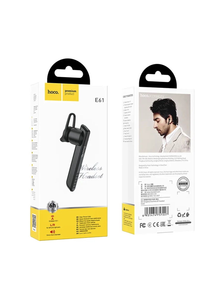 Hoco E61 – это универсальная Bluetooth гарнитура, идеально подходящая для офиса, конференций, рабочих звонков, колл-центров, такси и службы доставки. Теперь вы можете оставаться на связи в любое время, при этом освободив руки для более важных задач. Используя эту гарнитуру, вы сможете общаться, не нарушая правила дорожного движения, что особенно важно для профессионалов, работающих "на ходу".