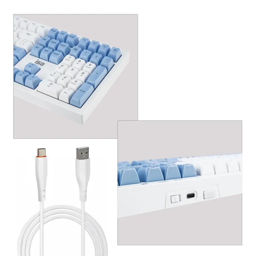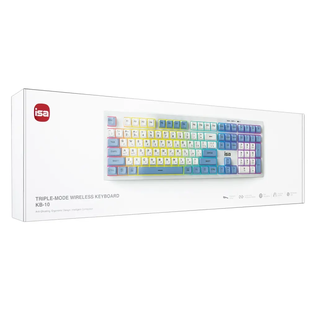 Беспроводная клавиатура ISA KB-10 в классическом белом корпусе предлагает универсальное трёхрежимное подключение через USB-Type-C кабель, Bluetooth и беспроводной адаптер 2.4 ГГц для максимальной гибкости использования. Устройство оснащено качественными мембранными клавишами, которые обеспечивают бесшумную работу, что делает её идеальной для офиса, дома и игровых сессий. Настраиваемая RGB-подсветка позволяет персонализировать внешний вид клавиатуры, а двухцветное исполнение кнопок в белом и синем вариантах добавляет стиля и удобства визуального ориентирования. Эргономичный дизайн и интеллектуальное соединение обеспечивают комфортную и стабильную работу в любых условиях.