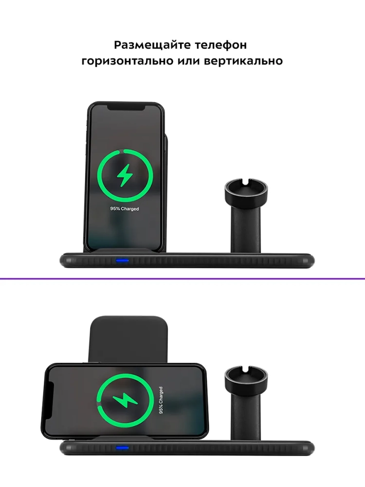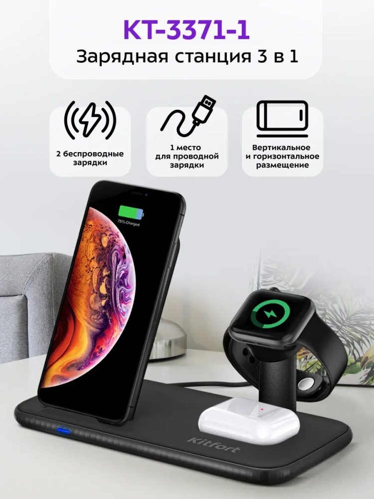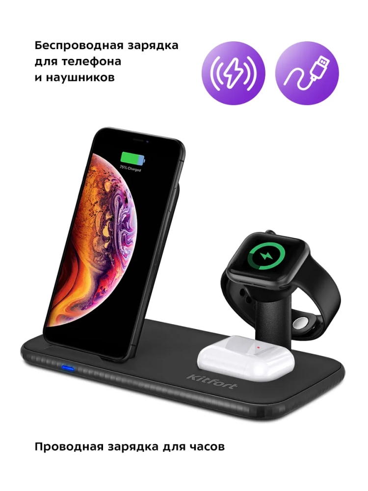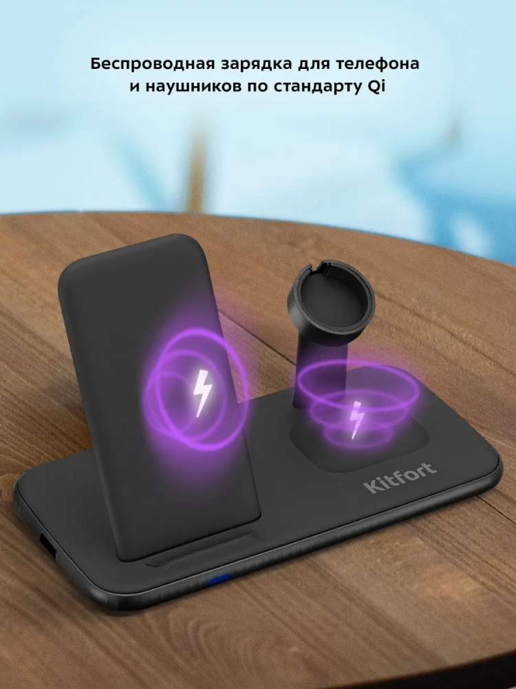 Зарядная станция Kitfort КТ-3371 позволяет заряжать телефон, часы и наушники, если они поддерживают функцию беспроводной зарядки. Устройство работает по стандарту Qi для индукционной передачи энергии. Многие современные смартфоны и умные часы поддерживают стандарт беспроводной зарядки Qi.