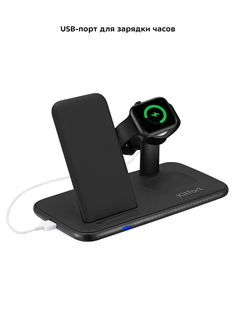 У зарядной станции Китфорт KT-3371 есть подставка для телефона, где можно расположить телефон как в вертикальном, так и в горизонтальном положении. Это очень удобно при использовании разных приложений или просмотре видео, если при этом телефон необходимо зарядить. На подставке для часов размещают часы, поддерживающие функцию беспроводной зарядки. А для зарядки наушников их кладут в область беспроводной зарядки наушников. Слева на корпусе есть USB-порт, поэтому вы можете использовать зарядную станцию и для проводной зарядки. Если ваши часы не поддерживают беспроводную зарядку, вы можете подключить шнур для зарядки часов к USB-порту зарядной станции, а часы разместить на подставке для часов. Однако некоторые модели часов могут не подходить по форме и потому плохо удерживаться на подставке.