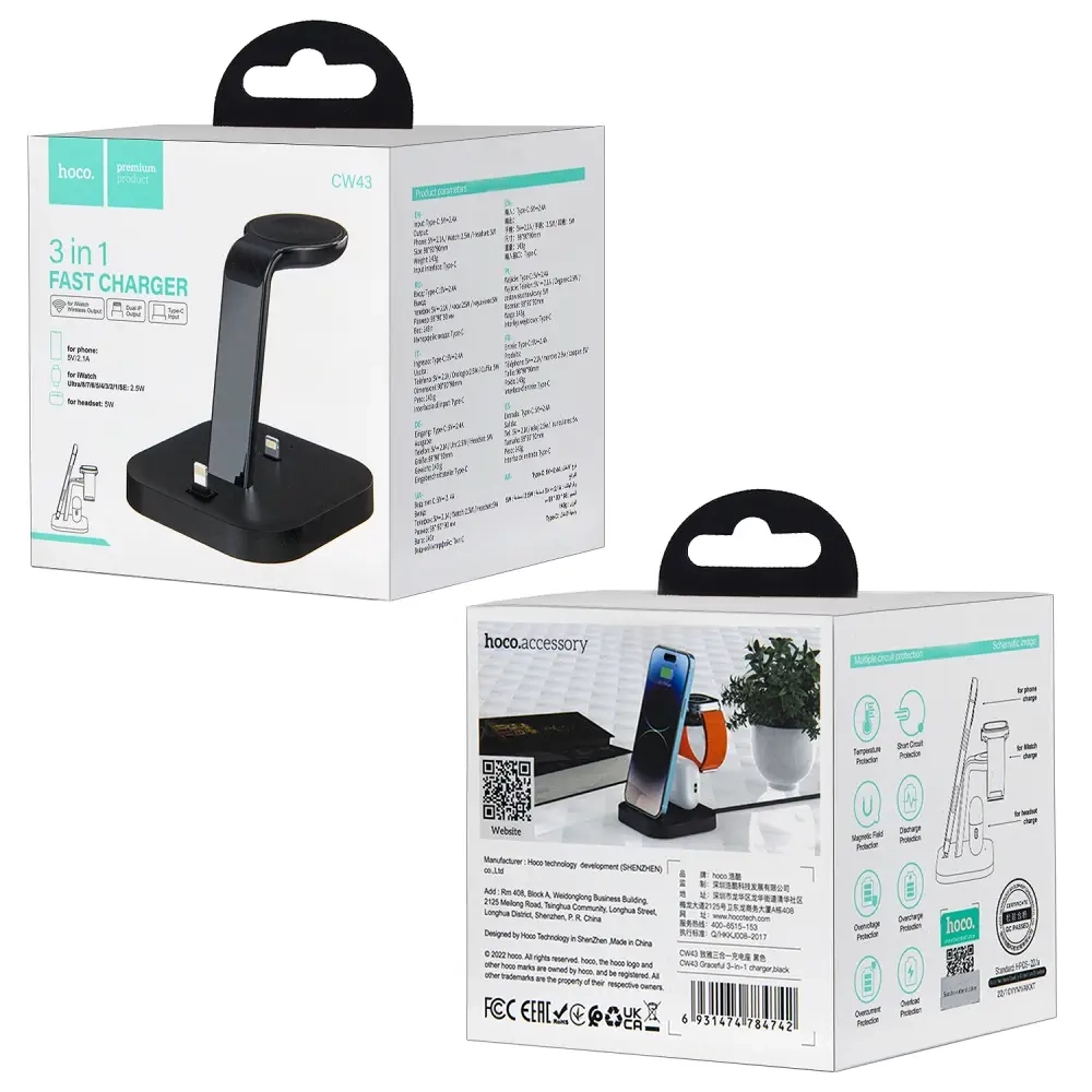 *Беспроводное зарядное устройство CW43 3 в 1 настольная зарядная станция HOCO черная