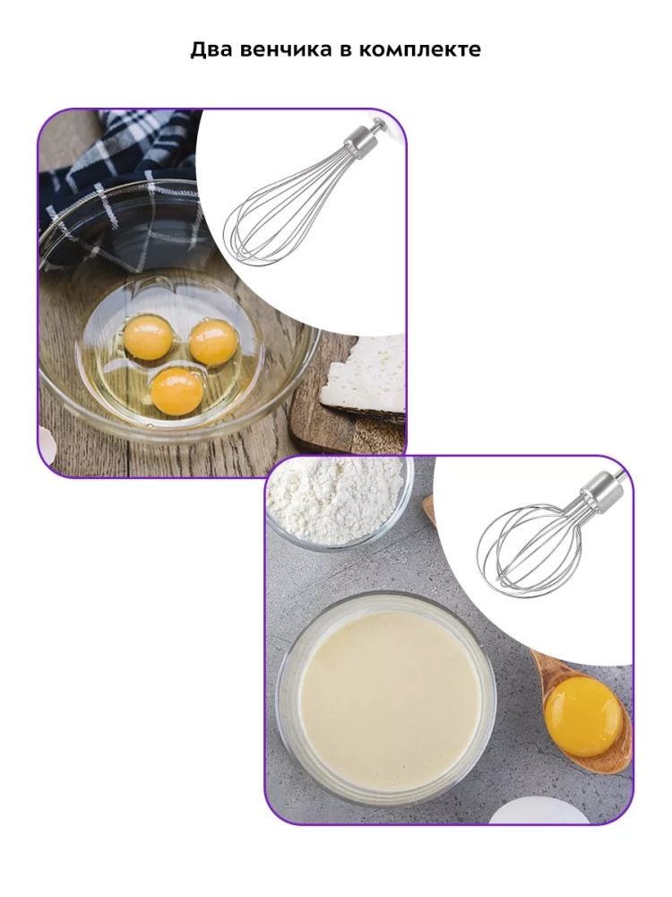 В комплекте с устройством поставляются две насадки. Венчик для взбивания подойдет для взбивания яиц и замеса жидкого теста для блинов, вафель или бисквитов, а венчик для масла — для приготовления кремов из масла и домашних соусов.