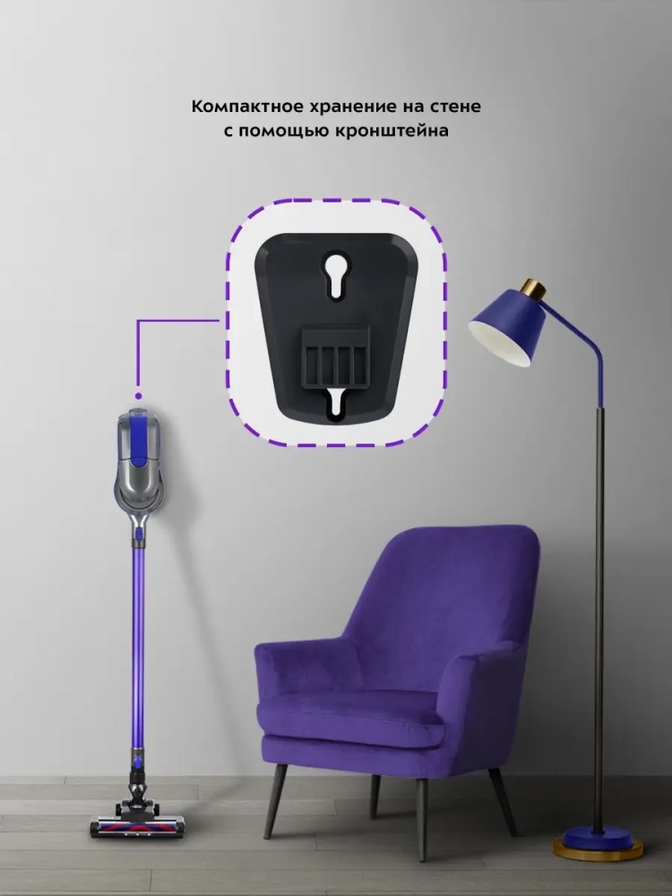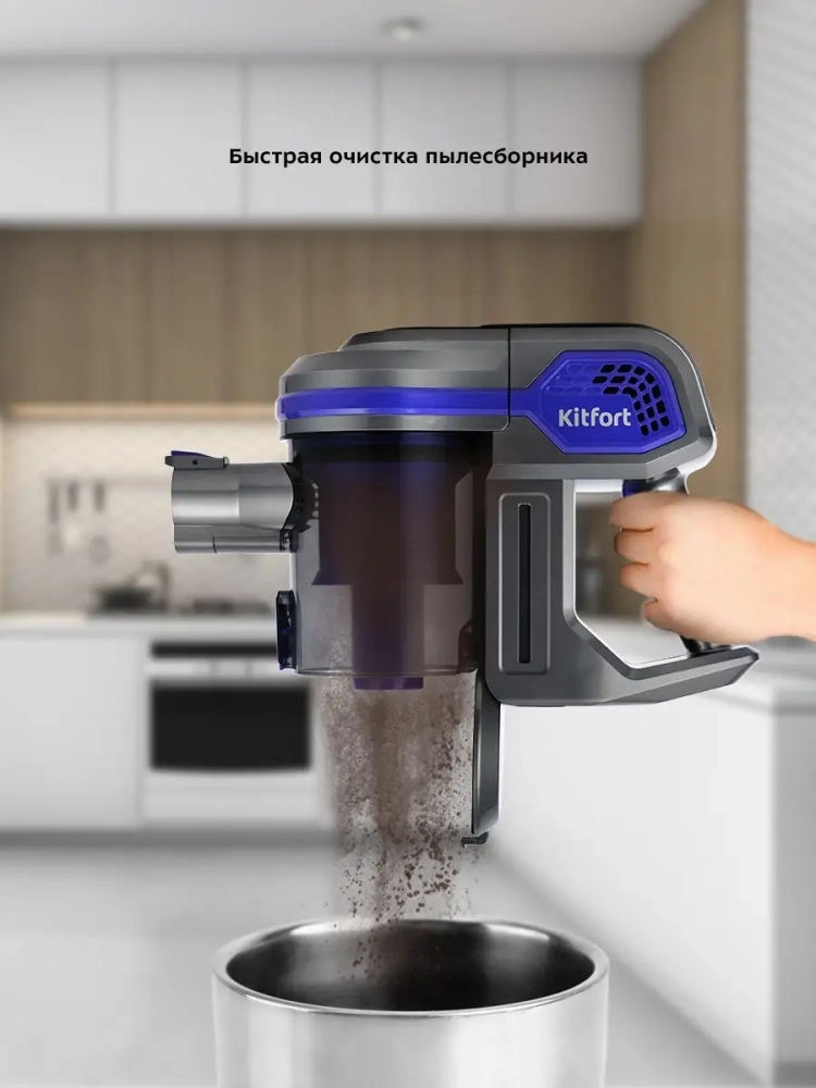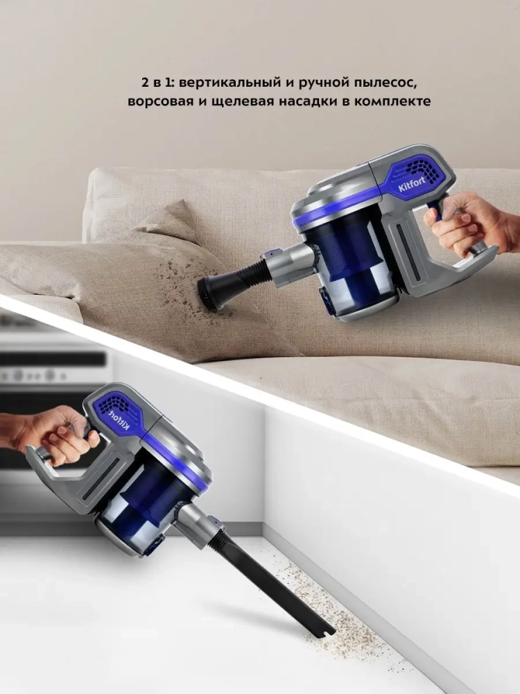 Беспроводной вертикальный пылесос Kitfort КТ-5103 очень удобен при локальной и генеральной уборке. Он компактен, всегда под рукой и готов к работе. При отсоединении удлинительной трубки и установке насадки он превращается в ручной пылесос. Его конструкция позволяет легко проникать в самые труднодоступные уголки квартиры. При этом не нужно передвигать громоздкий корпус аппарата и управляться с непослушным шлангом. Благодаря работе от аккумулятора не нужно включать вилку в розетку, провода не мешают под ногами. Поэтому пылесос имеет неограниченный радиус действия: от любого уголка квартиры до машины или беседки в саду. Пылесос комплектуется турбощеткой, которая помогает качественно справиться с очисткой гладких поверхностей и ковровых покрытий с не очень длинным ворсом. Также к пылесосу прилагаются щелевая насадка, ворсовая насадка и кронштейн для настенного хранения устройства. Светодиодная подсветка щетки сделает уборку комфортной даже в затемненных местах.