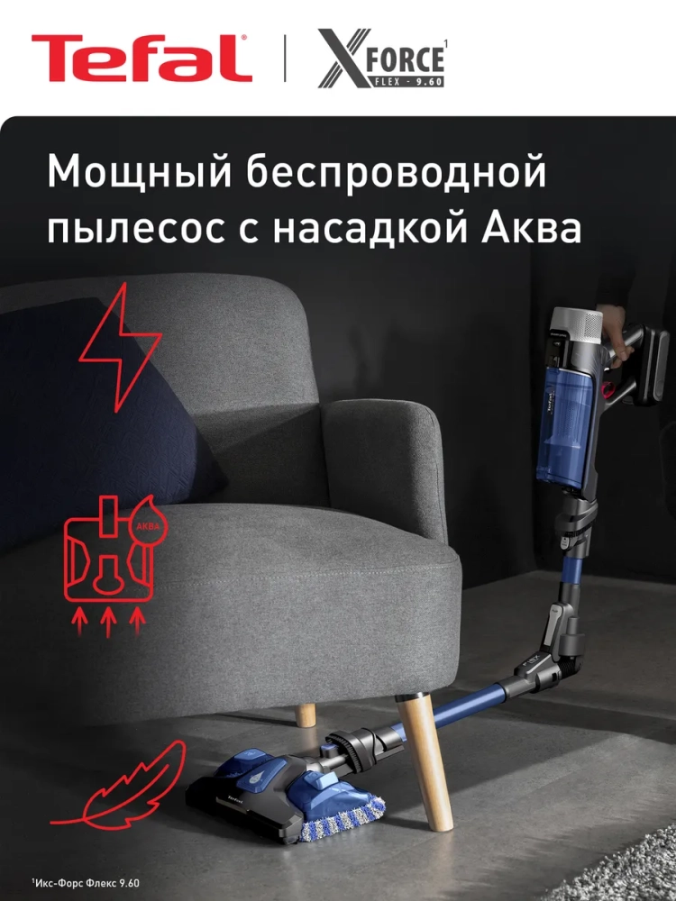 Беспроводной пылесос Tefal X-Force Flex 9.60 Aqua TY20C4WO. Как сделать уборку намного проще и приятнее? Ответит X-Force Flex 9.60 Aqua. Этот вертикальный пылесос не рассчитан на компромиссы: он объединяет высокую мощность всасывания до 100 аэроватт и вес всего 1.1 кг в ручном режиме, обеспечивая невероятное удобство и эффективность.