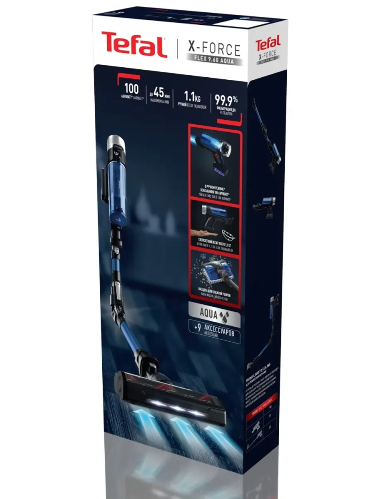 Откройте для себя инновации от Tefal: технология Aqua позволит объединить сухую и влажную уборку, гибкий корпус Flex поможет пылесосить без наклона даже в самых труднодоступных местах, автоматическая регулировка мощности всасывания позволит не повреждать напольные покрытия, емкий аккумулятор обеспечит до 45 минут непрерывной работы, а SMART-дисплей управления отобразит всю необходимую информацию для полногоконтроля за процессом уборки.