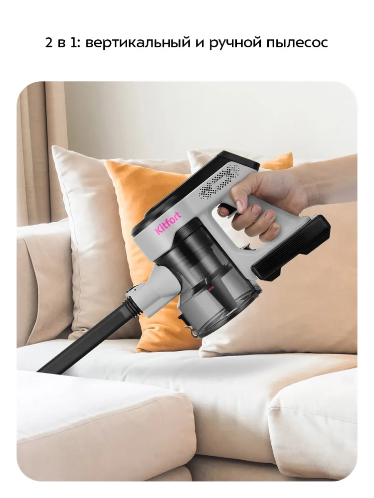 Беспроводной вертикальный пылесос Kitfort КТ-5308 очень удобен при локальной и генеральной уборке. Он компактен, всегда под рукой и готов к работе. При отсоединении удлинительной трубки и установке насадки он превращается в ручной пылесос. Его конструкция позволяет легко проникать в самые труднодоступные уголки квартиры.
