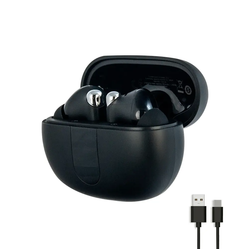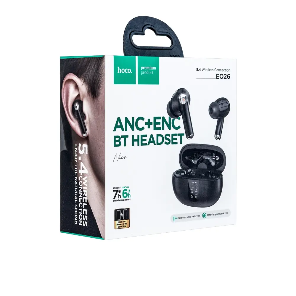 Наушники беспроводные Hoco EQ26 TWS нового поколения с превосходным громким звуком и глубокими басами, современным дизайном и сенсорным управлением, длительной работой в автономном режиме за счет особых аккумуляторов, обеспечивающих бесперебойное соединение по стандарту Bluetooth 5.4 и увеличивающих время работы до 7 часов. Благодаря технологии активного шумоподавления ANC вы сможете слушать любимую музыку без посторонних раздражителей, а шумоподавление ENC гарантирует четкую и качественную передачу голоса во время звонка. LED дисплей, который показывает уровень заряда аккумулятора, подскажет вам, когда устройство необходимо подзарядить. Маленькие наушники Hoco выглядят стильно благодаря специальной конструкции удерживающей петельки для крышки при открытии. Удобное расположение сенсоров не на ножке, а в верхней части каждого наушника. Наши блютуз наушники с микрофоном будут незаменимы для бега и занятий спортом. В комплект входит набор запасных амбушюр, благодаря чему наушники Хоко подойдут как подросткам, так и взрослым, и даже маленьким детям. Наушники беспроводные черные имеют на кейсе разъем Type-C для зарядного кабеля, который также идет в комплекте. Наушники для телефона совместимы с устройствами iOS, Android и Windows, то есть станут отличной альтернативой большим наушникам для компьютера: ноутбука или ПК.