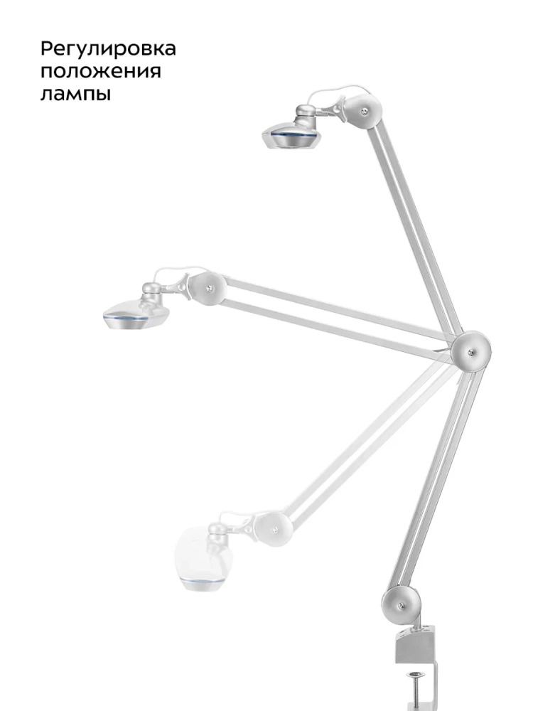 У лампы КТ-3724 несколько поворотных механизмов, благодаря которым вы можете отрегулировать необходимое положение лампы. Лампа надежно крепится к столешнице с помощью металлической струбцины. Струбцина позволяет прикрепить лампу к горизонтальной поверхности толщиной до 70 мм.