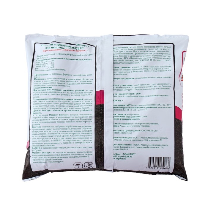 ОПИСАНИЕБиогрунт на основе биогумуса для цветущих растений 5 лСостав:Питальный торфяной субстрат.Речной песок.Биогумус.Азот (NH4+NO3) 170.Фосфор (P2O5) 170.Калий (K2O) 160.pH 6,0-6,2 Массовая доля влаги не более 65%Преимущества:Безопасно для здоровья и природы. Благодаря натуральным составляющим биогрунт позволяет растениям лучше расти и качественно обогащает почву без вреда для планеты и здоровья человека.Улучшает всхожесть семян.Обеспечивает ускорение роста.Способствует приживаемости растений.Улучшает их декоративные качества.Биогрунт не содержит веществ искусственного происхождения, семян, сорных растений, безопасно для окружающей среды, теплокровных животных, птиц, рыб, насекомых.Назначение: Полностью готовый к применению субстрат для посадки и пересадки всех видов цветочных и декоративных культур, выращивания рассады, выращивания комнатных, оранжерейных цветов и садовых цветов.Применение: На дно цветочного горшка насыпте керамзитовый дренаж слоем от 1 до 3 см в зависимости от размера горшка. Присыпте дренаж биогрунтом "Для цветочных культур", затем слегка уплотнить, посадить растение оставив свободное пространство для полива не менее 2-х см от края горшка. Растение после посадки полить.** Класс опасности:** 4 (малоопасные).