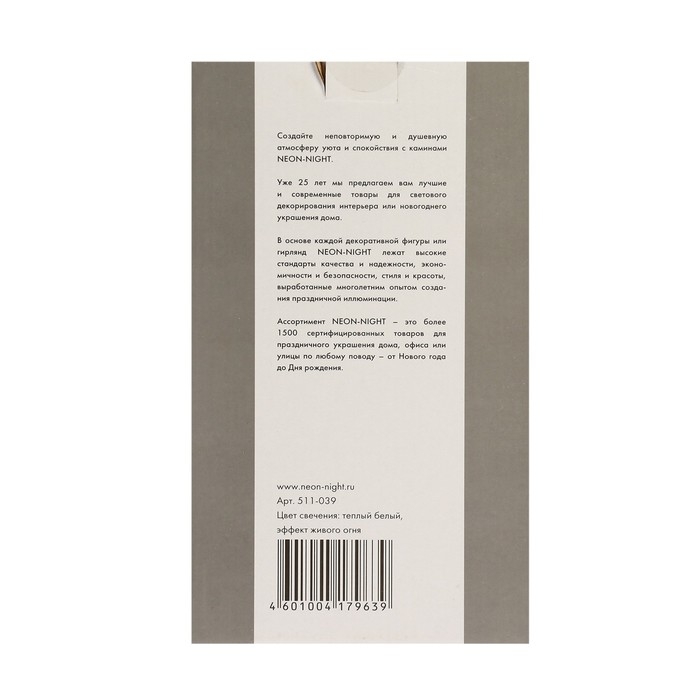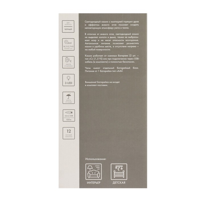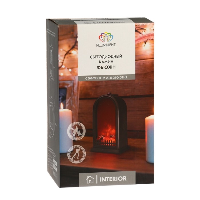 Светодиодный камин с эффектом живого огня «Фьюжн» имеет микрочип, который создаёт динамику имитирующую плавное движение огня. Светодиодный камин не нагревает, не выделяет вредных веществ, питается от 2 батареек типа С или через адаптер питания и USB-кабель. Клавиша включения расположена на корпусе. Предназначен для использования в помещениях с умеренной влажностью.