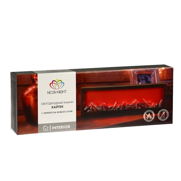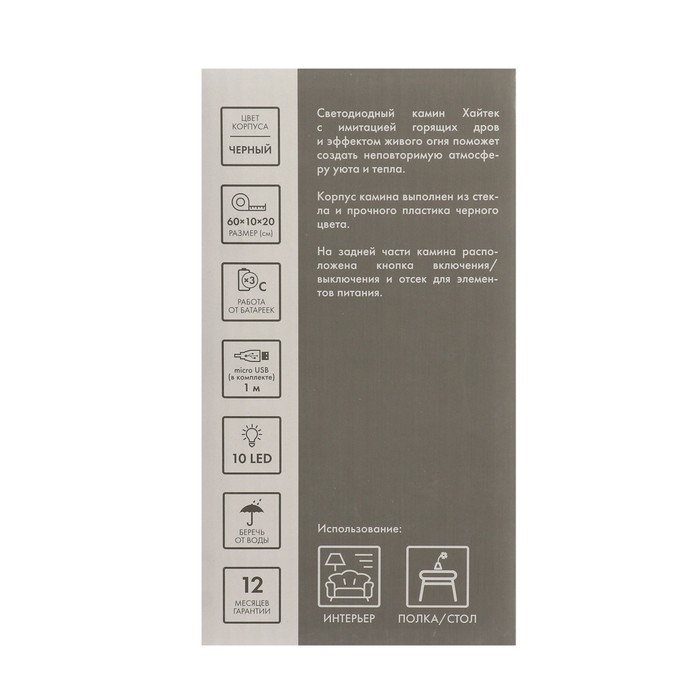 Светодиодный камин «Хайтек» имеет фасад с эффектом состаренной поверхности. На корпусе расположен перекидной выключатель. Работает от 3 батареек типа С или адаптера питания и USB-кабеля. Светодиоды не нагреваются и экономно расходуют заряд элементов питания. Динамическое свечение создаёт эффект живого, плавно двигающегося огня и натуральный вид раскалённых углей.