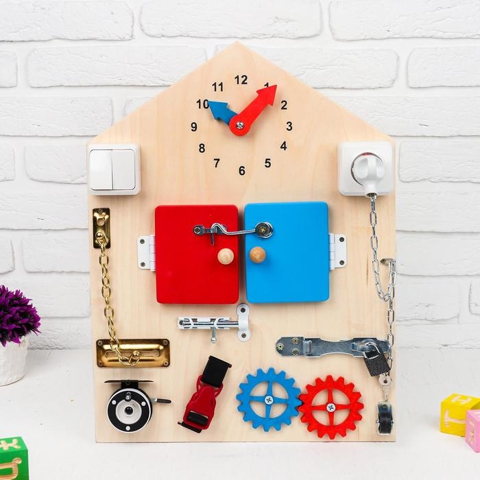 - Стимулирует логическое мышление: поиск ключей к замочкам, открывание и закрывание дверок, шестерёнки и другие элементы учат причинно-следственным связям.