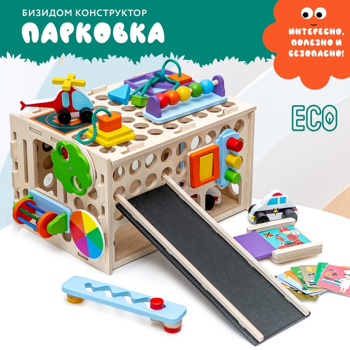 Бизидом — многофункциональная игрушка, которая одновременно является парковкой для машин и бизибордом. На всех гранях бизидома находятся разные интересные элементы: шестерёнки, молния, часы, розетка и многое другое. Если открыть крышку бизидома, то внутри вы увидите дорогу, по которой можно катать машинки. Также в бизиборде есть отделение, в которое можно ставить машинки.