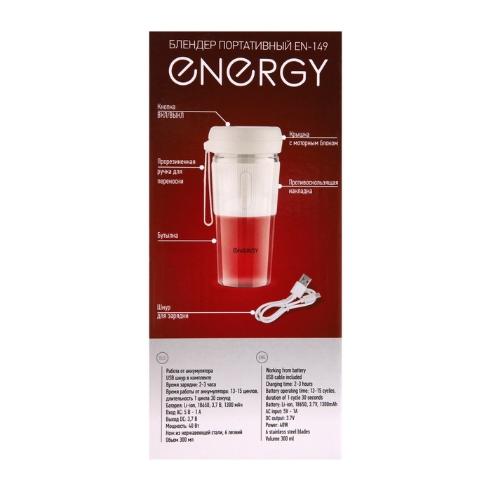 Блендер Energy EN-149, портативный, 40 Вт, 0.3 л, 18000 об/мин, белый