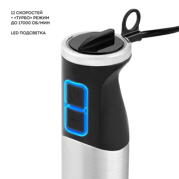 Плавная регулировка скорости позволяет измельчать или взбивать различные по плотности продукты и подбирать необходимую скорость в соответствии с рецептом.