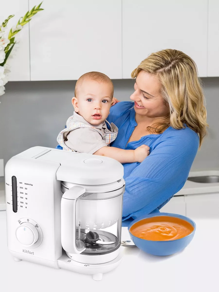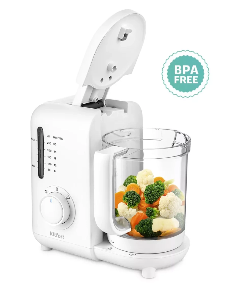 Вкусные и полезные блюда лучше всего готовить на пару — продукты готовятся равномерно и не пригорают, в них сохраняются полезные вещества и витамины. Для прикорма маленьких детей приготовленную пищу необходимо измельчить до нужной консистенции. Блендер-пароварка Китфорт КТ-2320 готовит в два приема: варит на пару, затем измельчает и смешивает. Он будет хорошим помощником родителям на кухне и поможет сэкономить время. Благодаря постоянной циркуляции пара в чаше, продукты в корзине равномерно прогреваются и готовятся. По окончании готовки прибор автоматически отключается, поэтому пища не переварится.
