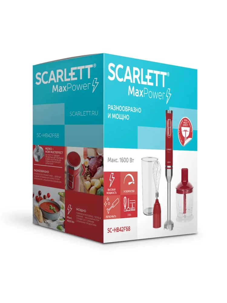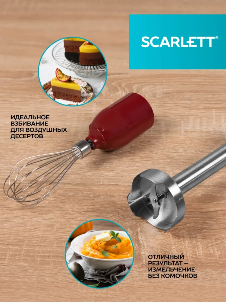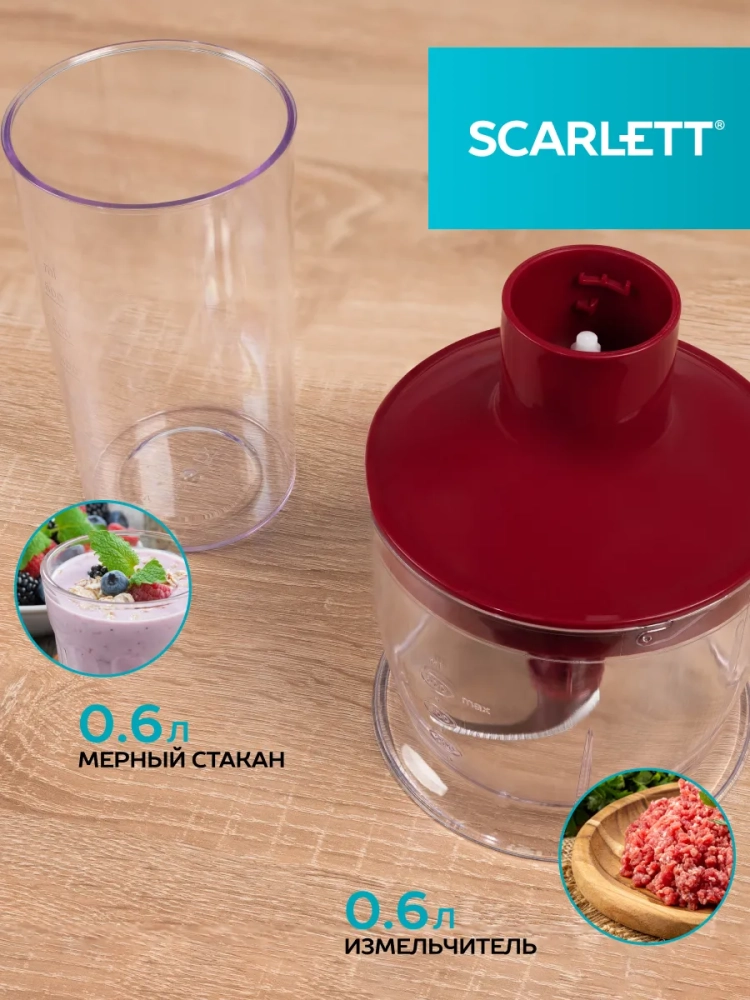 Блендер Scarlett SC-HB42F68 многофункционален и прост в управлении. Модель оснащена регулировкой скорости с помощью поворотного переключателя и режимом «Турбо». В наборе с блендером поставляются венчик, чаша для измельчения на 0.6 л и мерный стакан объемом 0.6 л. Нож погружной части MULTIEFFECT с двумя укороченными вертикальными лезвиями для повышения режущей силы, изготовленный из нержавеющей стали собственной марки STEEL PRO, гарантирует тщательное измельчение и смешивание ингредиентов в однородную массу. Эргономичная форма рукоятки позволяет комфортно удерживать блендер во время работы. Двигатель имеет защиту от перегрузки.