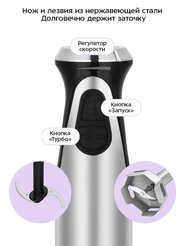 Нож насадки-блендера, венчик и лезвия ножа чаши измельчителя выполнены из нержавеющей стали, что обеспечивает их долгий срок службы.