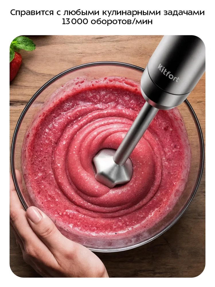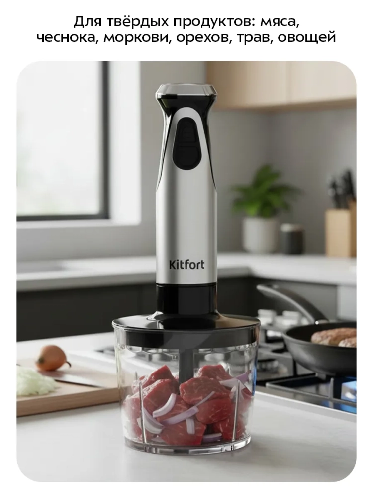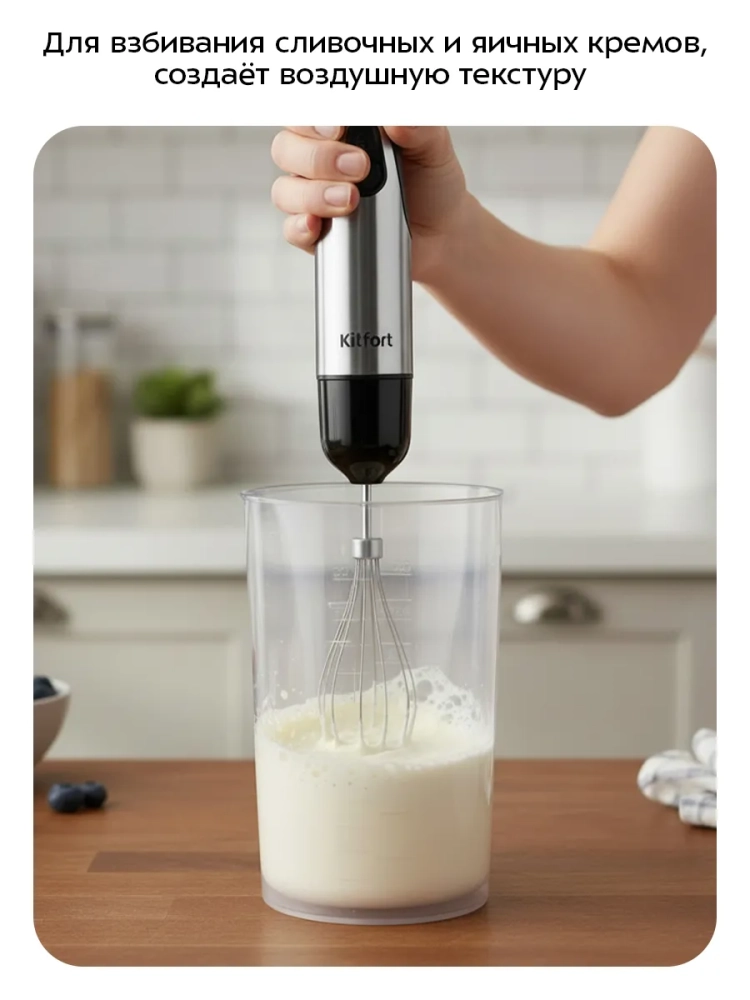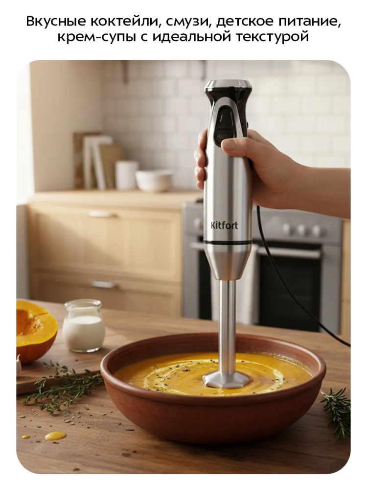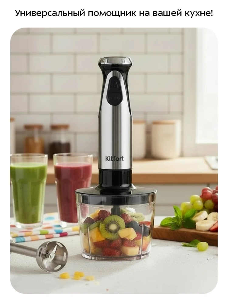 Погружной блендер «4 в 1» Kitfort КТ-3544 — универсальное кухонное устройство, с которым вы сможете приготовить множество блюд для себя, своих родных и друзей. Устройство предназначено для смешивания, взбивания, гомогенизации, приготовления фруктовых и фитнес-напитков, супов-пюре, соусов, муссов, молочных коктейлей, детского питания, картофельного пюре, а также для замеса жидкого теста.