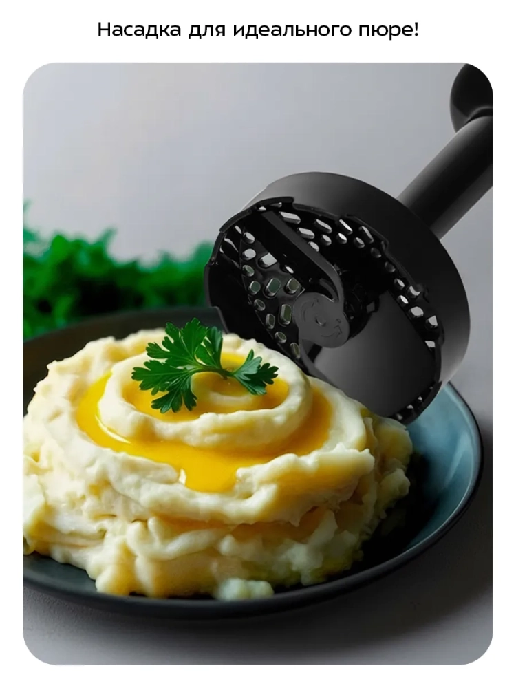 Прибор оснащен тремя насадками и чашей измельчителя емкостью 500 мл, благодаря которым устройство может использоваться четырьмя способами: насадка-блендер измельчает и смешивает ингредиенты в однородную консистенцию, насадка-венчик предназначена для приготовления жидкого теста и взбивания яичных белков, в чаше измельчителя можно быстро измельчить мясо, сыр, овощи или ягоды, а с помощью насадки для пюре можно приготовить любое пюре из вареных овощей. Смешивать ингредиенты удобно во вместительном и глубоком пластиковом стакане емкостью 700 мл, который идет в комплекте с устройством.